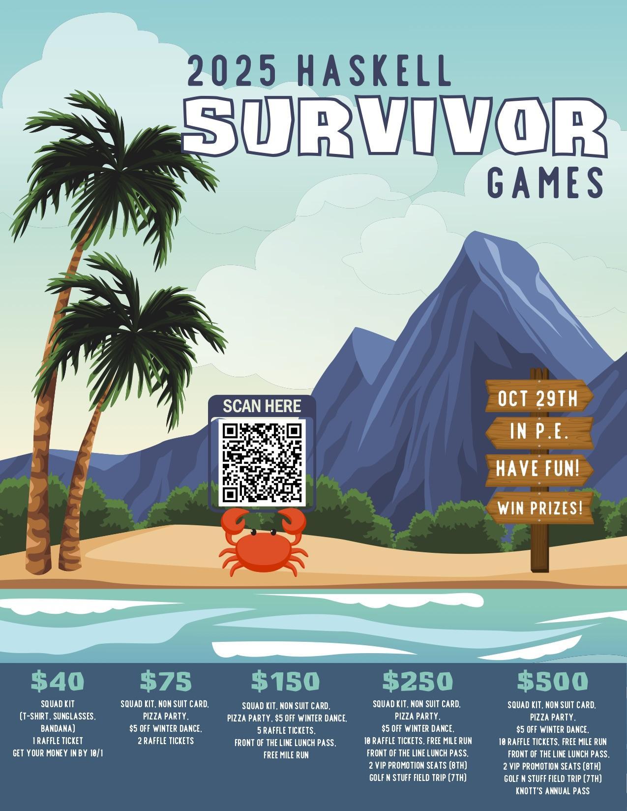 Time is running out to secure a race kit for the 2025 Haskell Survivor Games that will take place on Wednesday, October 29th. We have extended the deadline to Friday, October 3rd. With a $40 donation, students will receive a race kit. The race kit includes an event t-shirt, sunglasses, bandana, and 1 raffle ticket to enter into a raffle for a prize. It is easy to make a donation by turning in cash to Mrs. Denhart or by clicking HERE to pay online.